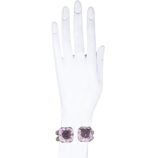 Bronze bamboo open cuff bracelet with 2 cushion cut pink quartz, aged silver color